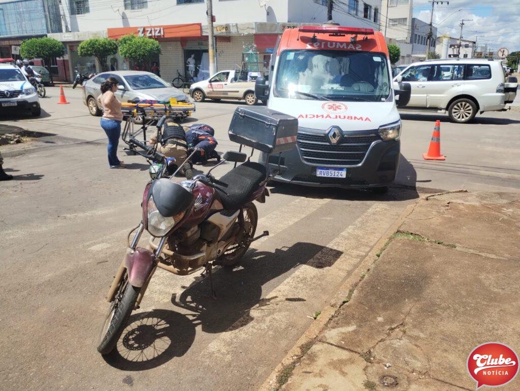Um motociclista ficou ferido num acidente na Avenida Brasil, esquina com a Rua Barão do Rio Branco, no Centro de Patos de Minas. A batida foi no início da tarde desta sexta-feira (22).