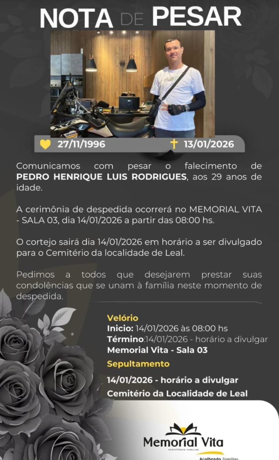 Pedro Henrique Luís Rodrigues, de 29 anos, morreu na noite desta terça-feira (13) após se envolver em um grave acidente na Avenida JK, no bairro Ipanema, em Patos de Minas. O motociclista, que trabalhava como entregador, foi fechado por um carro que fugiu do local sem prestar socorro.