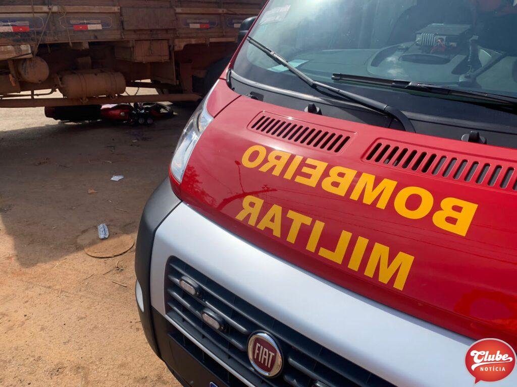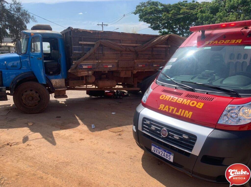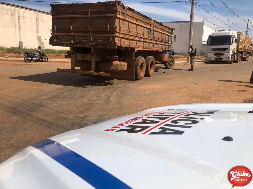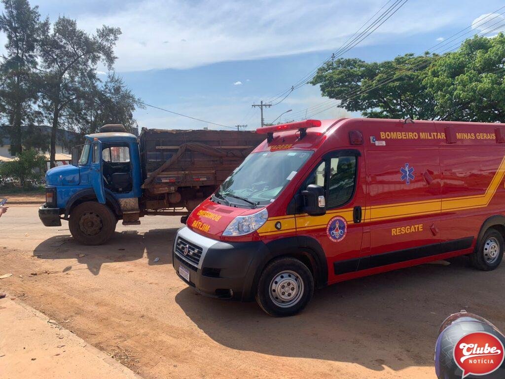 Um motociclista, de 28 anos, ficou ferido após bater na lateral de um caminhão. O acidente aconteceu na esquina da avenida Júlia Fernandes Caixeta com a rua Odilon Pessoal, no bairro Cidade Nova, em Patos de Minas. O condutor e seu veículo foram parar sob o caminhão.