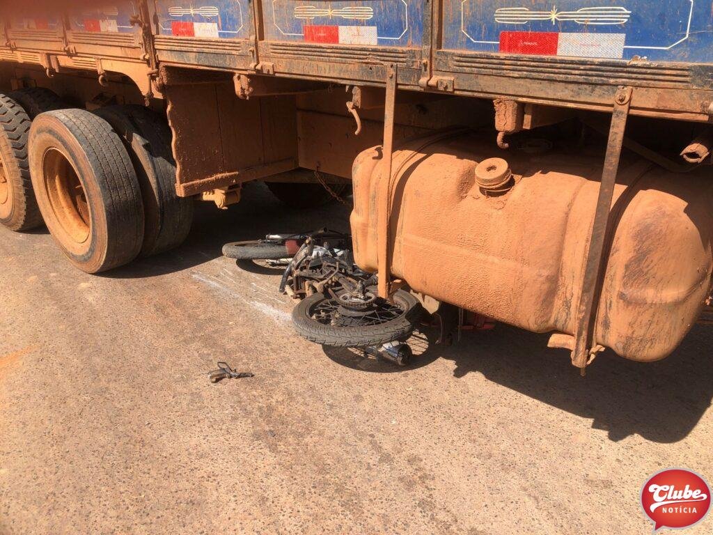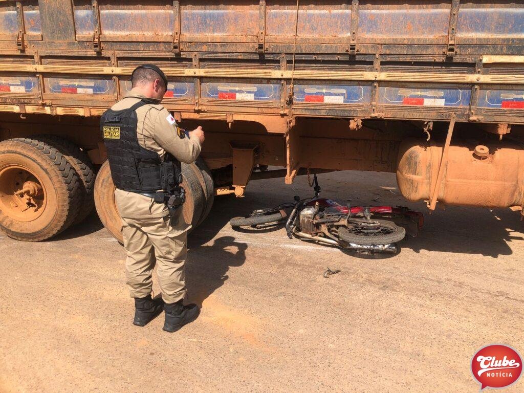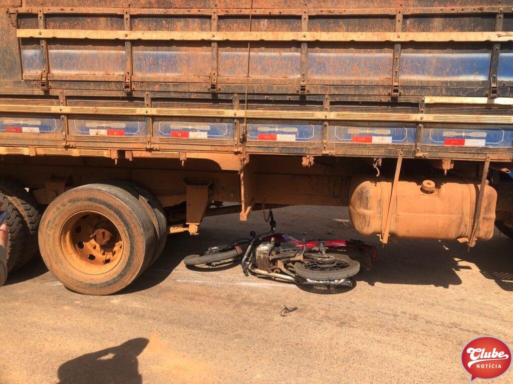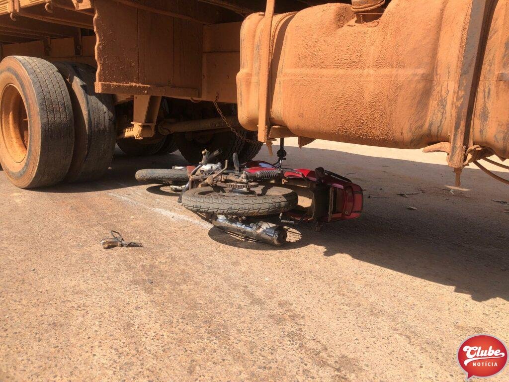 Um motociclista, de 28 anos, ficou ferido após bater na lateral de um caminhão. O acidente aconteceu na esquina da avenida Júlia Fernandes Caixeta com a rua Odilon Pessoal, no bairro Cidade Nova, em Patos de Minas. O condutor e seu veículo foram parar sob o caminhão.