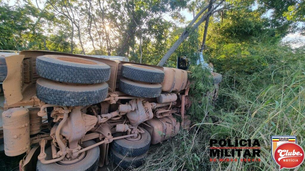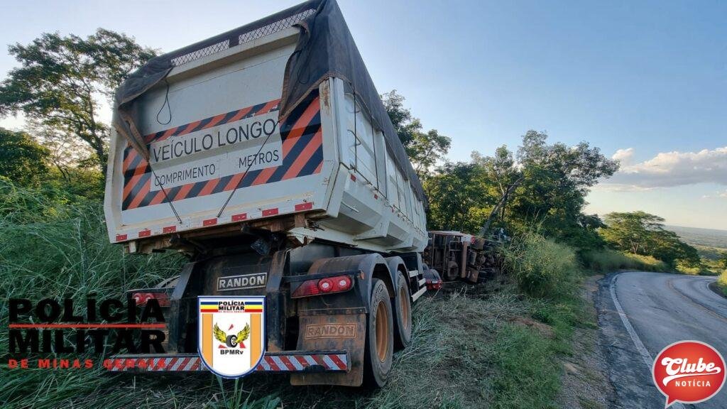Segundo o condutor que era o único ocupante, H.B.M. de 35 anos, conduzia a combinação veicular no sentido decrescente, Presidente Olegário à BR-040, quando viu uma combinação veicular parada na pista em sentido contrário e outra combinação veicular com caminhão trator vermelho, ultrapassando a primeira, invadindo a sua pista direcional; que para evitar uma mal maior e não se chocar frontalmente com esta, virou o volante para a lateral esquerda, vindo a tombar na faixa de domínio, em meio à vegetação.
