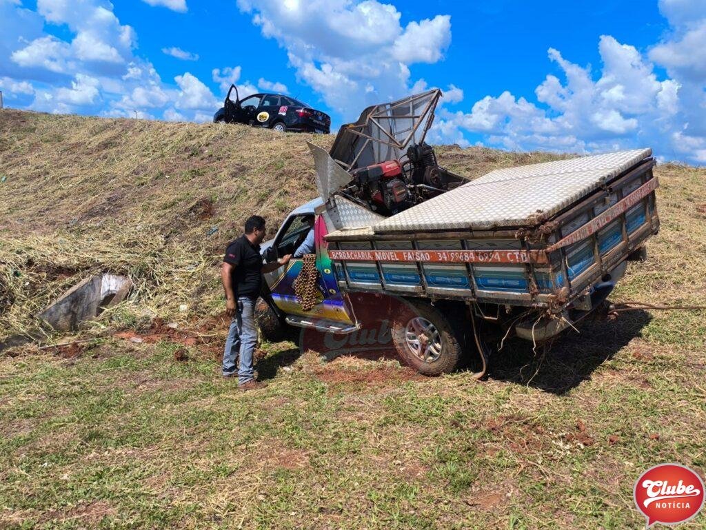 Na tarde desta quinta-feira (23), um acidente foi registrado no Trevo da Pipoca, em Patos de Minas. De acordo com o relato do condutor, a caminhonete apresentou uma falha na direção, o que fez com que ele perdesse o controle do veículo e tombasse na via.