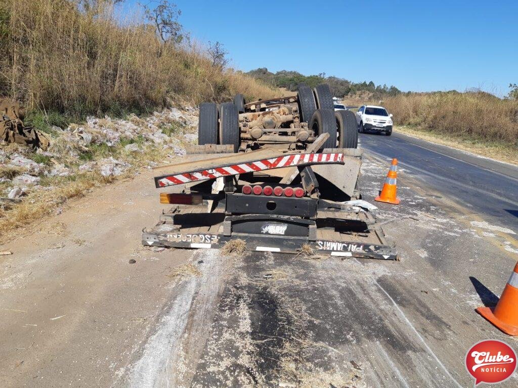 Um motorista ficou ferido após tombar um caminhão carregado com feijão. O acidente aconteceu na noite desta quinta-feira (10/08) no KM 361, da BR-365, entre Patos de Minas e Varjão de Minas.