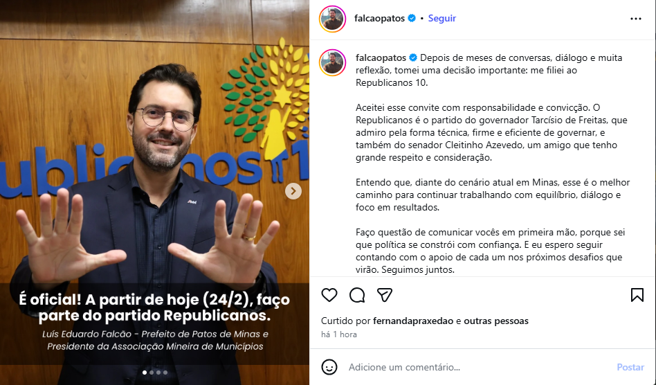 Em postagem realizada nas redes sociais, Falcão disse que a filiação ao partido foi feita com muita “responsabilidade e convicção” e que, segundo o prefeito, “diante do cenário atual em Minas, esse é o melhor caminho para continuar trabalhando“.