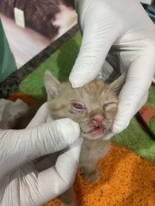 A gatinha foi imediatamente levada à clínica veterinária onde o médico veterinário constatou hemorragia cerebral, lesão craniana direita, edema cerebral e grave lesão ocular.