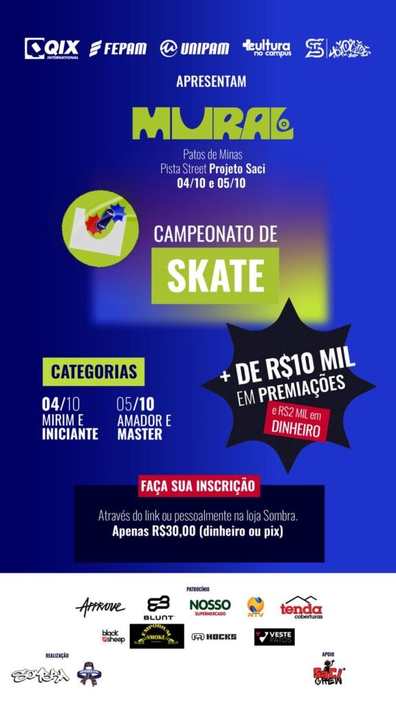 Idealizado pela loja Sombra Roupas e Acessórios, o MURAL tem a participação de alunos do 8º período do curso de Publicidade e Propaganda do UNIPAM, que contribuíram para o desenvolvimento e para a organização da iniciativa. O projeto nasce com o propósito de valorizar a cultura urbana, incentivar a prática esportiva e oferecer lazer acessível a toda a comunidade.