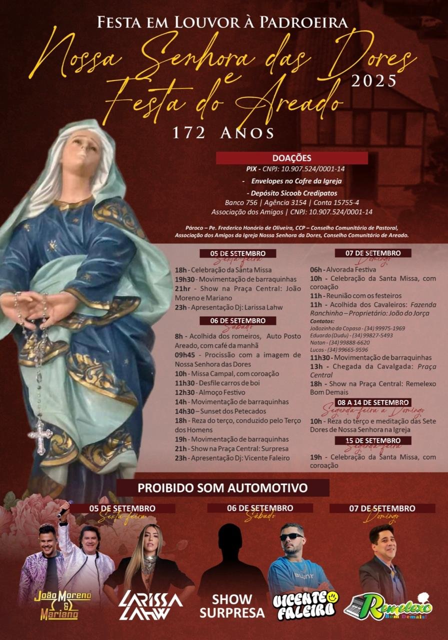 A comunidade do Areado já se prepara para viver momentos de alegria e tradição com a Festa do Areado, que celebra os 172 anos da comunidade em louvor a Nossa Senhora das Dores e acontece nos dias 5, 6 e 7 de setembro de 2025. O evento promete agitar a região com uma programação diversificada, unindo música, cultura e confraternização.