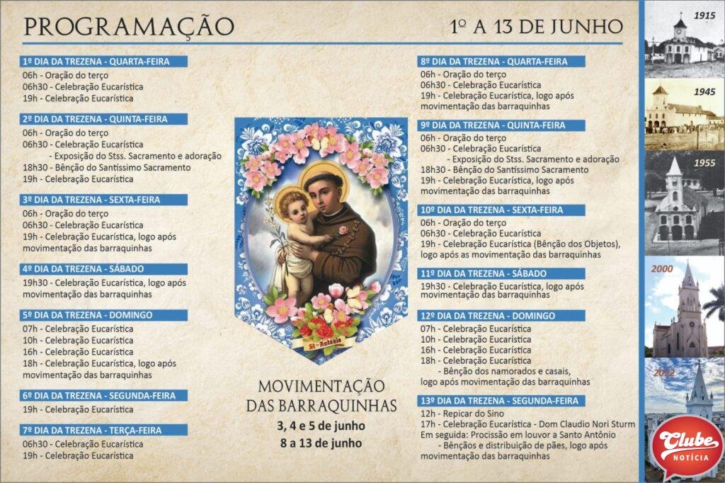 Celebrações religiosas e a trezena de Santo Antônio que acontece nos primeiros treze dias do mês de junho, também fazem parte da programação.