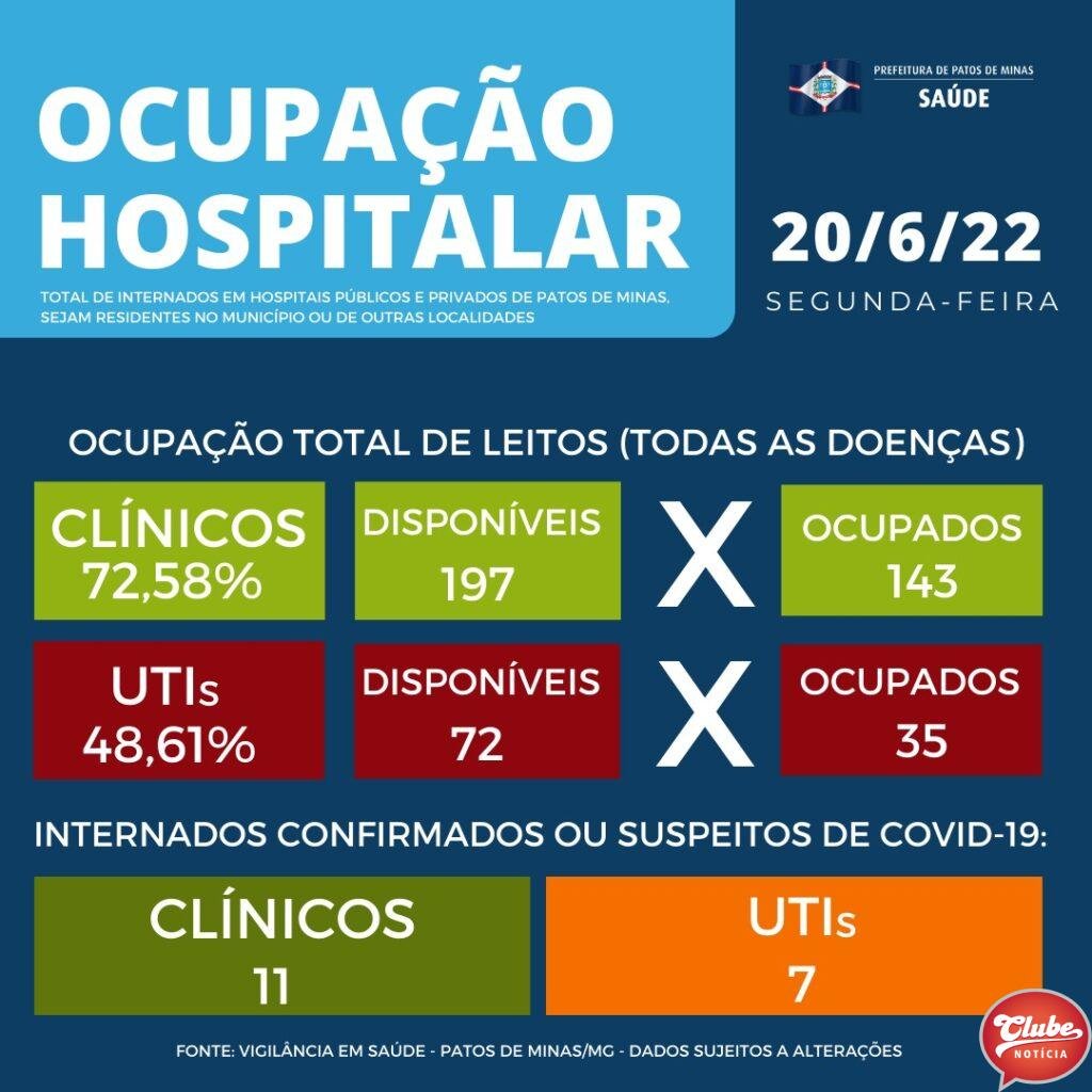 Em relação às internações, o boletim registrou 18 pessoas internadas, sendo 11 pacientes internados em leitos clínicos e 7 pacientes em leitos de UTI, esses números consideram pacientes residentes em Patos de Minas e também pacientes de outros municípios internados na cidade, considerando leitos públicos e privados.