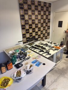Entre o material apreendido estavam pistolas calibres .22, .40, 9mm, .45 e .380, uma submetralhadora de fabricação caseira, uma espingarda calibre 12, um rifle calibre .22 e revólveres calibre .38.