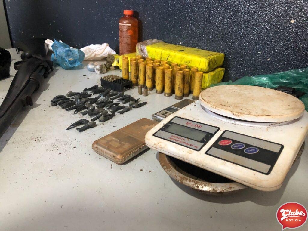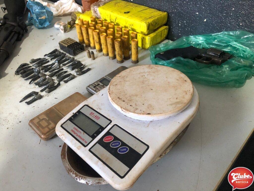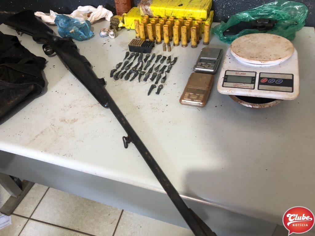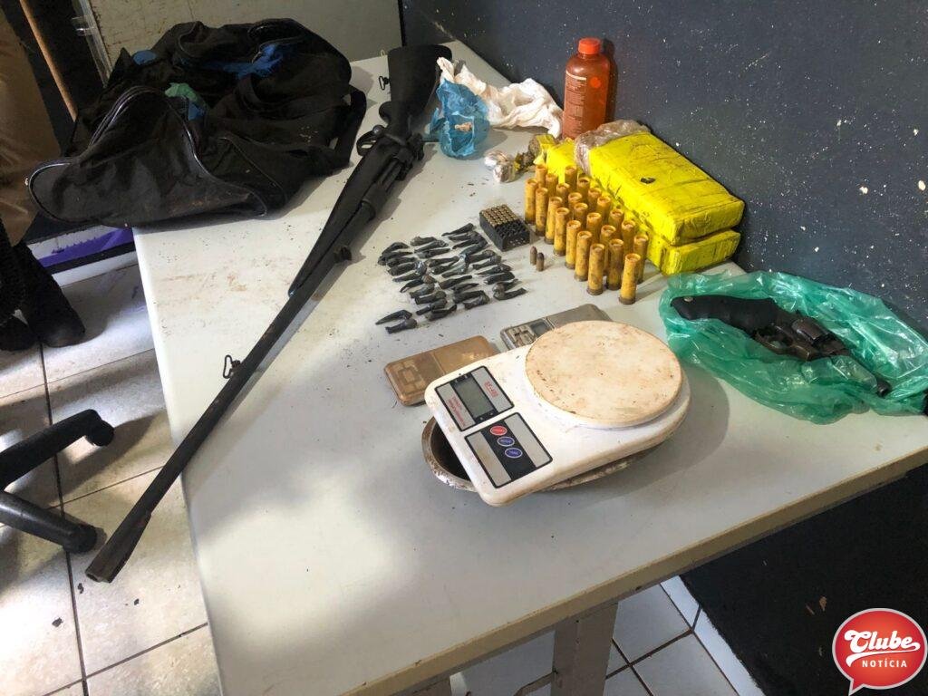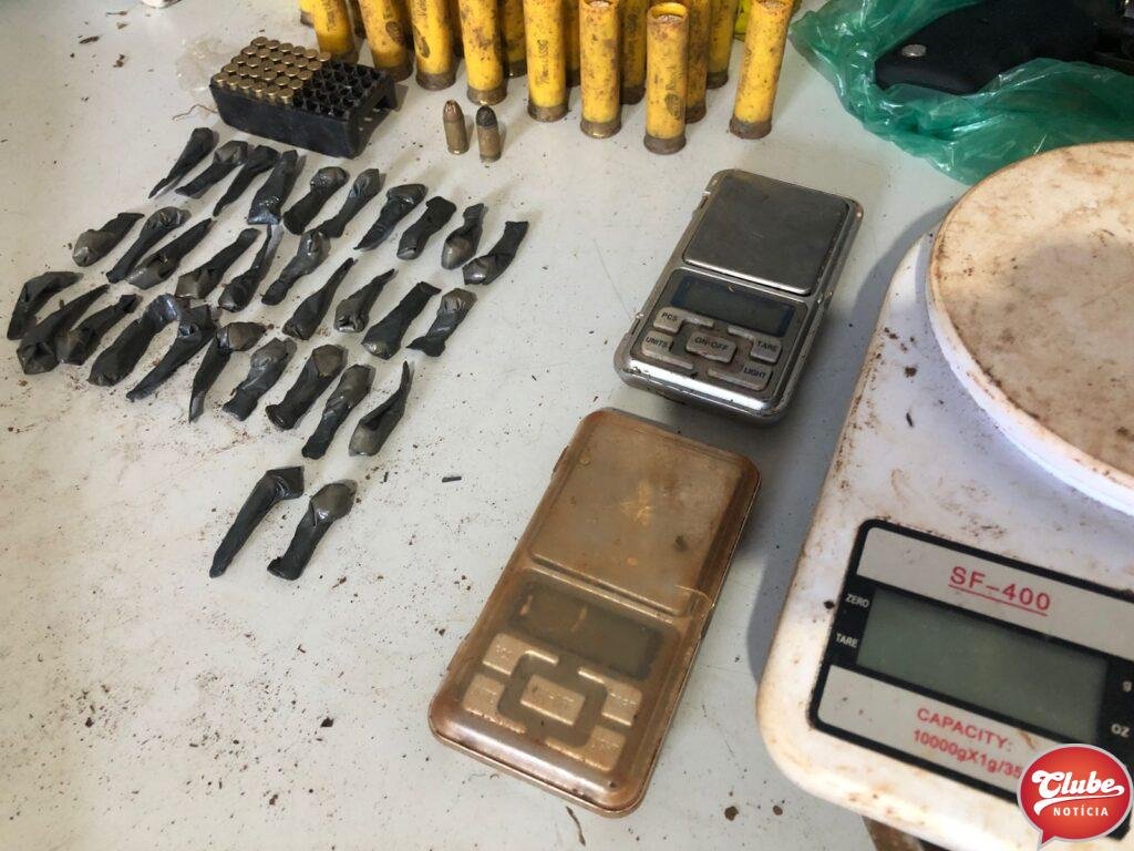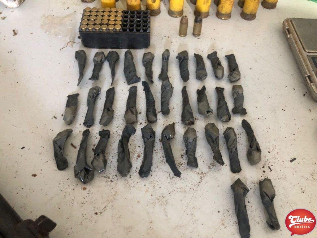 Com apoio dos cães farejadores, os policiais realizaram buscas na mata e encontraram duas barras, duas buchas e um tablete de maconha, 32 dolas de cocaína, duas pedras grandes de crack, três balanças, um revólver calibre .22, um fuzil calibre 762, 23 cartuchos calibre 20, 30 munições calibre .22, duas munições calibre .32, uma mala, uma bandeja e material usado para embalar a droga. Todo o material estava enterrado no meio da mata.