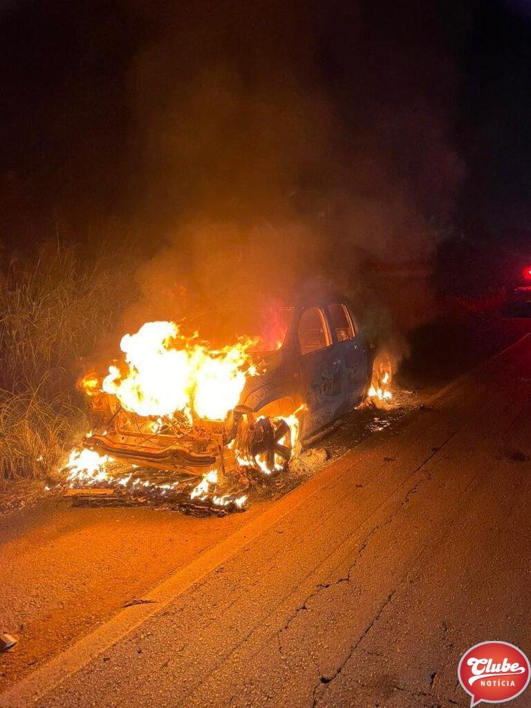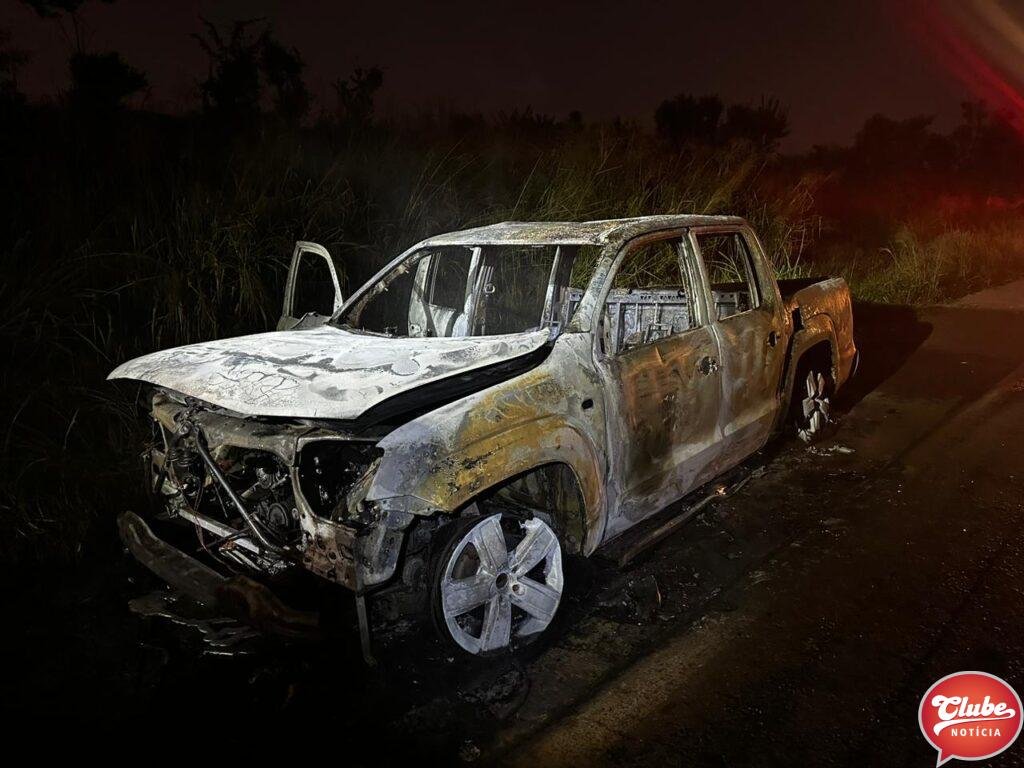 Em seguida a Polícia Militar tomou conhecimento sobre um veículo em chamas as margens da BR 365. A guarnição policial deslocou para o local confirmando ser a camionete da suposta vítima.