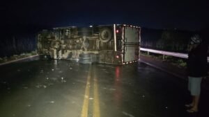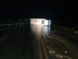 Na madrugada desta segunda-feira (13), por volta de 1h40, um caminhão Volkswagen 17.280 tombou no km 329 da BR-354, entre o trevo de São Gotardo e o trevo de acesso ao distrito de Guarda dos Ferreiros, em Rio Paranaíba.