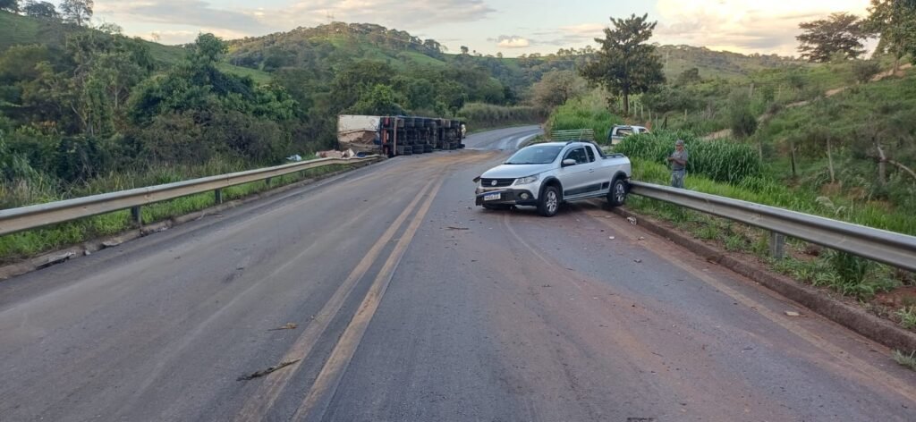 Caminhão carregado com soja tomba após falha mecânica na MG-410, em Presidente Olegário