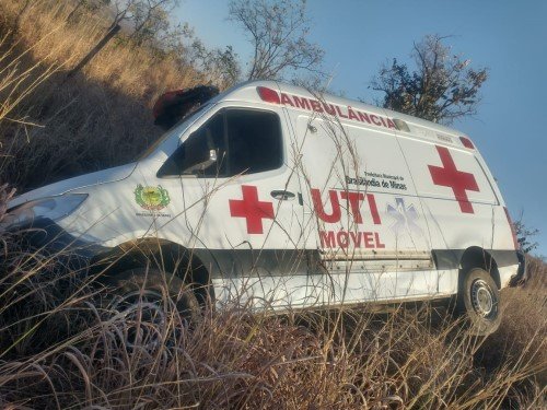 Ambulância sai da pista na MG-410 durante transporte de paciente, em Presidente Olegário