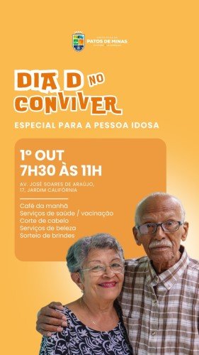 A Prefeitura de Patos de Minas convida a população idosa do município para participar de uma manhã especial de celebração, cuidado e serviços no próximo dia 1º de outubro. O evento, denominado “Dia D no Conviver – Especial para a Pessoa Idosa”, ocorrerá no Centro de Convivência da Terceira Idade – Conviver, marcando o Dia Internacional da Pessoa Idosa.