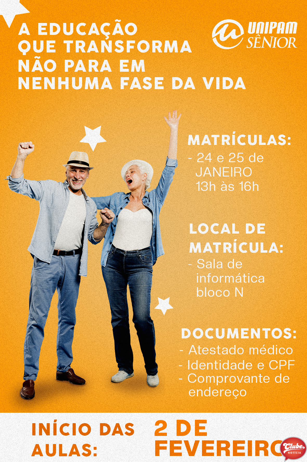 Para as pessoas que participarão do Programa UNIPAM Sênior, pela primeira vez, será necessário trazer no ato da inscrição os seguintes documentos: atestado médico, CPF, comprovante de endereço e RG.