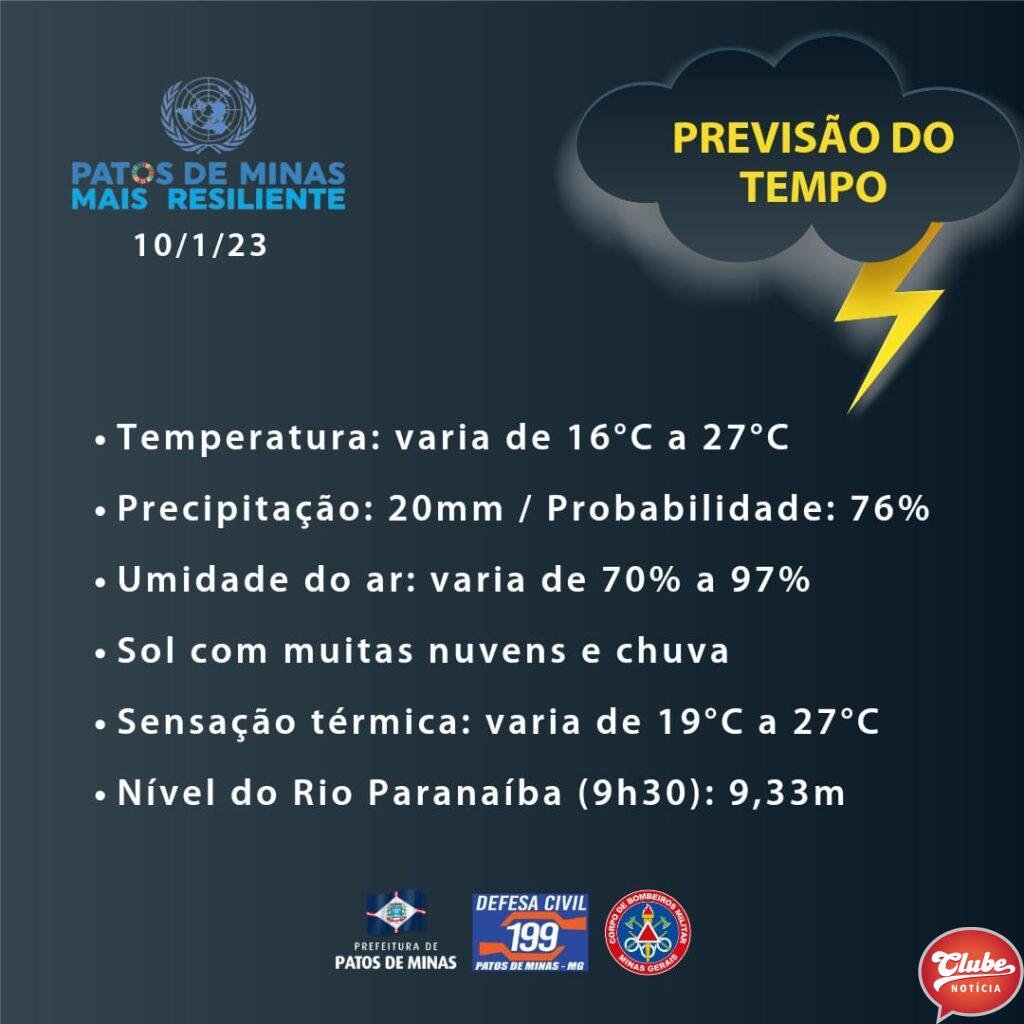 Devido às fortes e constantes chuvas registradas em Patos de Minas e região nos últimos dias, o nível do Rio Paranaíba continua chamando a atenção. De acordo com medição realizada pela Defesa Civil por volta das 7h desta terça-feira (10/01), o nível do Rio estava em 9,33 metros acima do nível normal.