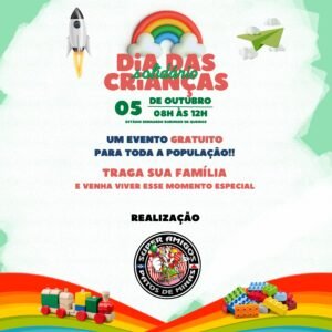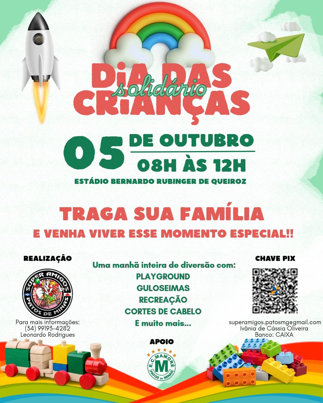 Vem aí o Dia das Crianças Solidário, no domingo, 05 de outubro, das 08h às 12h, no Estádio do Mamoré. Será uma manhã repleta de alegria, brincadeiras, guloseimas, recreação e muita diversão para toda a criançada. Um evento sem fins lucrativos, totalmente gratuito e aberto a toda a população!