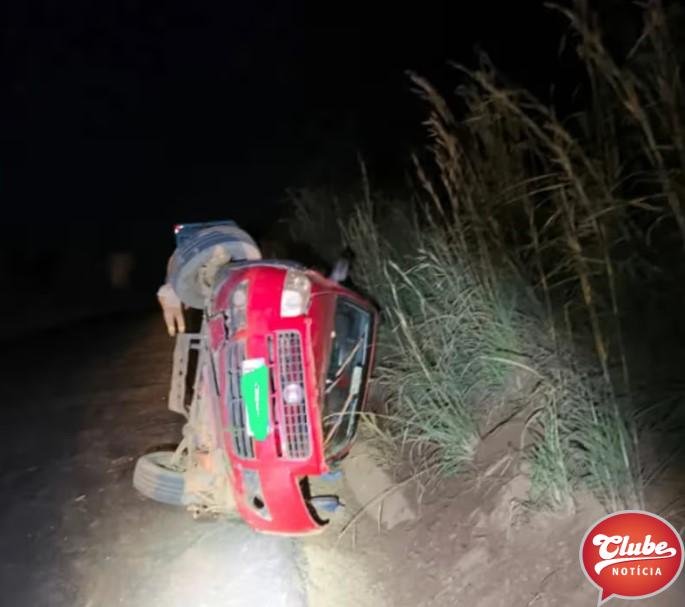 Com o impacto, o Fiat Strada rodou na pista e tombou de lado no acostamento, no sentido contrário da rodovia. Apesar do susto, ninguém se feriu.