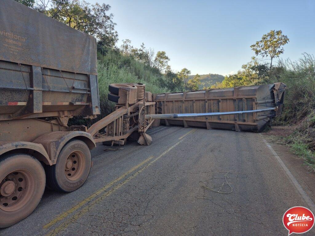 Caminhão trator com calcário agrícola tomba na MG 188, em Coromandel