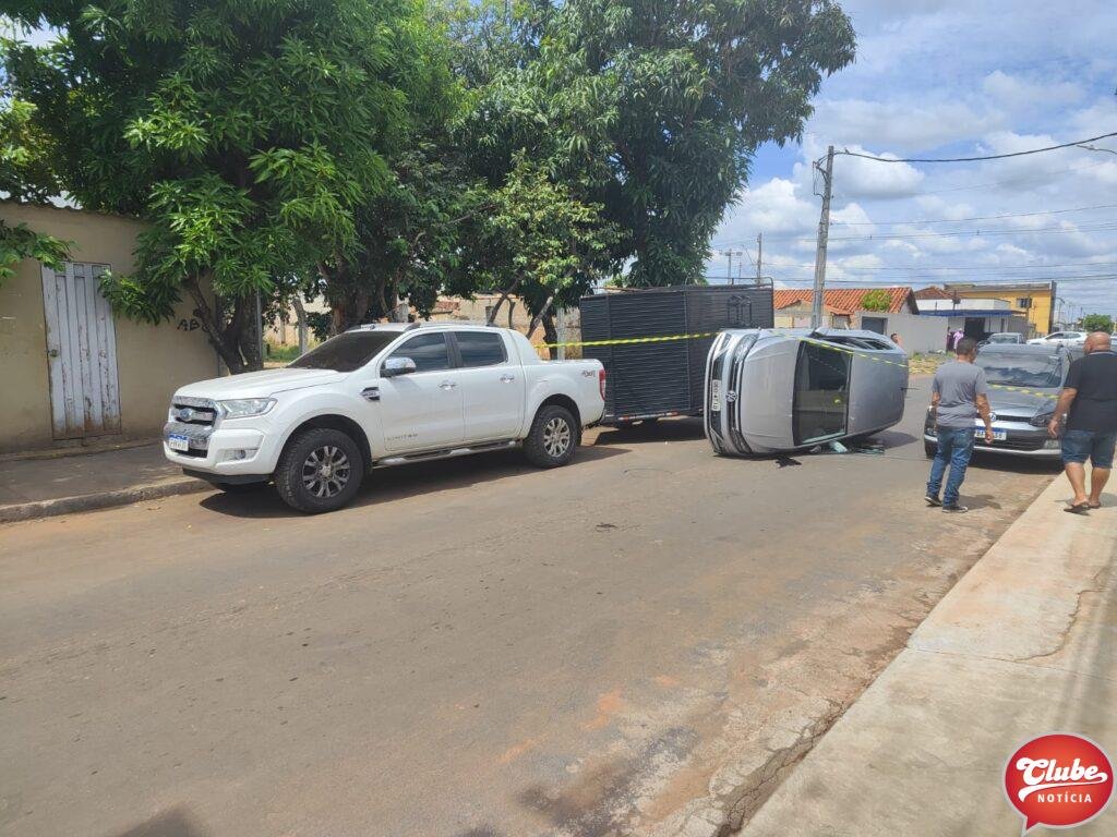 Carro acaba tombado após bater em carretinha no Bairro Cristo Redentor em Patos de Minas
