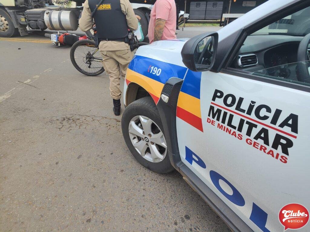 Um motociclista ficou ferido após avançar uma parada obrigatória e ser atingido por uma carreta na avenida JK, em Patos de Minas
