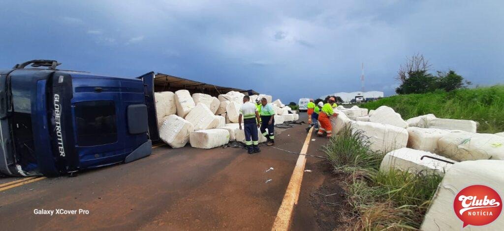 Caminhão carregado com algodão tomba na BR-365; motorista não se feriu