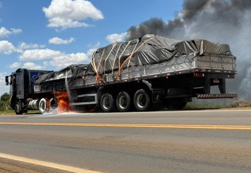 Pneu estoura e caminhão carregado pega fogo na MG-230, em Rio Paranaíba