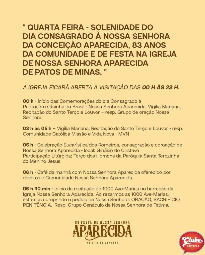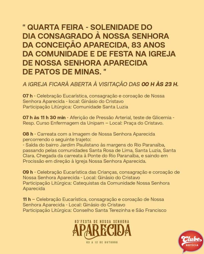 A Tradicional Festa de Nossa Senhora Aparecida realizada todos os anos em Patos de Minas, retorna a programação 100% presencial. Nesta quarta-feira, 12 de outubro, a programação estendeu toda a madrugada com o início das comemorações do dia Consagrado à Padroeira e Rainha do Brasil – Nossa Senhora Aparecida com Vigília Mariana, Recitação do Santo Terço e Louvor.