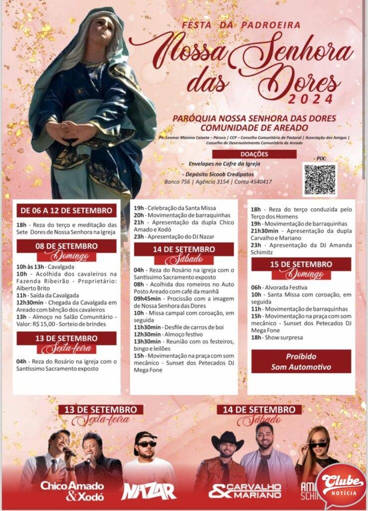 Confira a programação da Festa de Nossa Senhora das Dores de Areado de 2024: