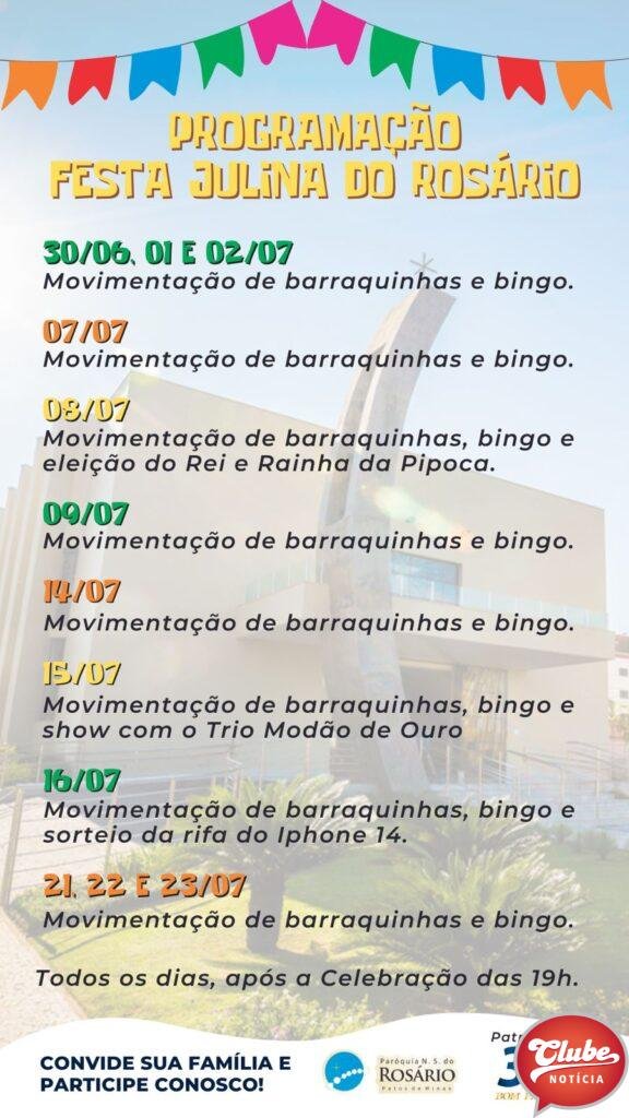 Acontece, entre os dias 30 de junho e 23 de julho, a tradicional festa Julina da Paróquia Nossa Senhora do Rosário.