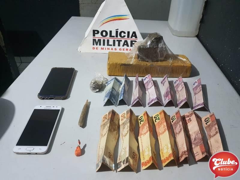 Após buscas, os militares encontraram uma barra, três tabletes e um cigarro de maconha, uma dola de cocaína, dois celulares e R$ 199,00.