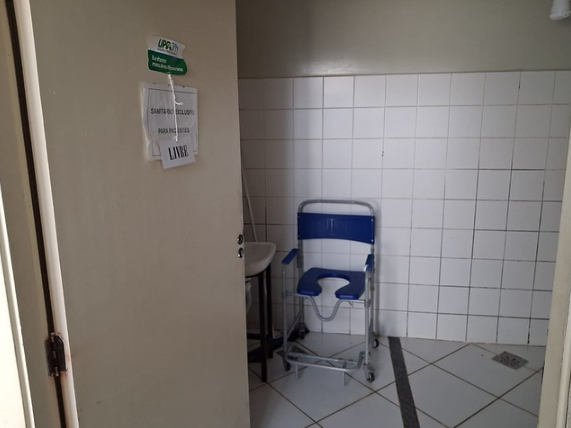 - Banheiro adaptado para pessoas com deficiência com porta abrindo para dentro, contrariando normas de acessibilidade;