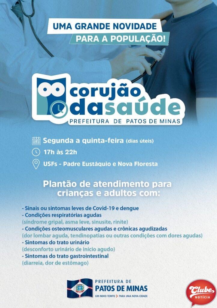 No mês de junho, pessoas com suspeita de dengue e Covid-19 foram atendidas de segunda a quinta-feira de 17h às 22h em quatro USFs de Patos de Minas. A partir da próxima segunda-feira 4 de julho, se você sofre de enxaqueca e teve uma crise de dor, a sinusite ou a rinite atacaram, a dor do torcicolo está incomodando muito ou de repente começou um forte desconforto urinário, ou outras queixas que não caracterizam urgência e emergência poderá buscar atendimento nas USFs Padre Eustáquio ou Nova Floresta de segunda a quinta-feira, das 17h às 22h.