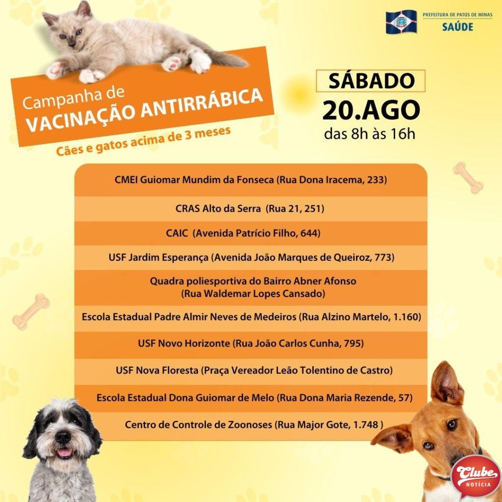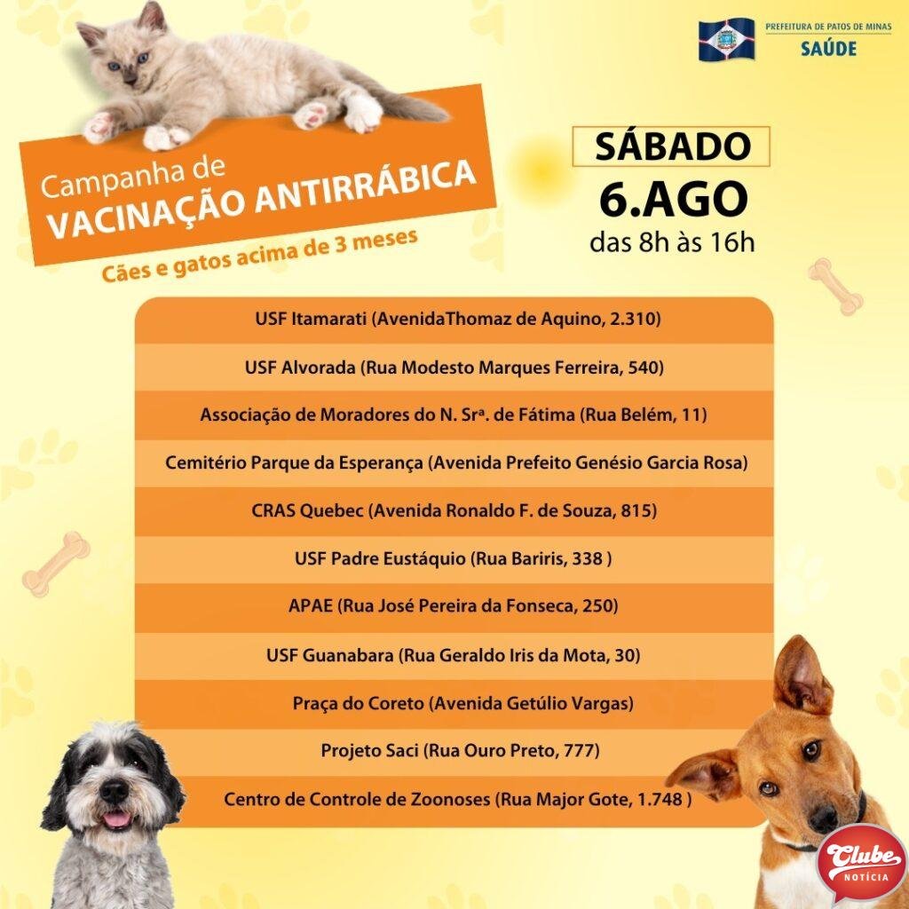 Patos de Minas iniciará na próxima semana a Campanha Antirrábica 2022. No meio rural a vacinação começa já na segunda-feira (1º/8). Para animais cujos tutores residem no meio urbano, a campanha tem início no sábado (6/8). A vacina é para cães e gatos com idade acima de três meses.