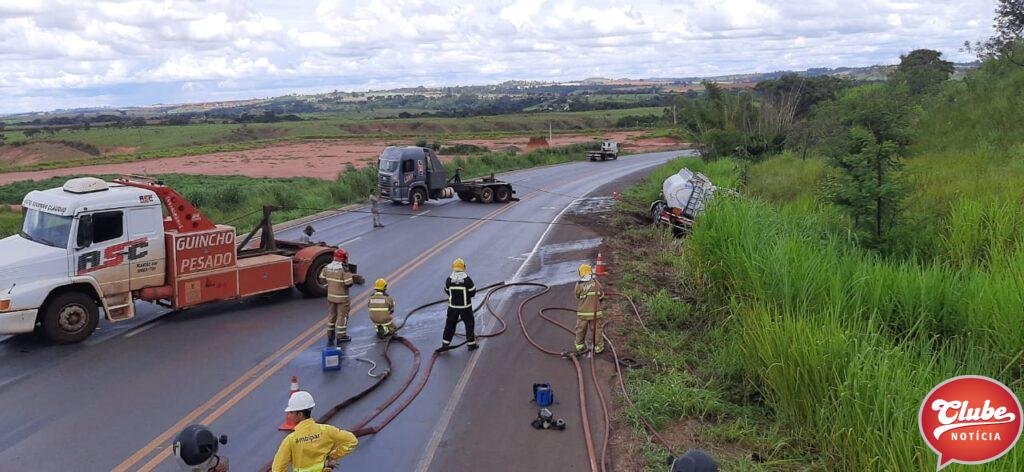 Equipes do Corpo de Bombeiros, da Polícia Rodoviária Federal (PRF) e de uma empresa especializada em transporte de produtos perigosos realizam a retirada de uma carreta de transporte de combustíveis que saiu da pista, no km 408, da BR-365 em Patos de Minas.